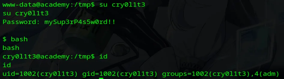 cry0l1t3也是adm群組的成員,可以讀取/var/log