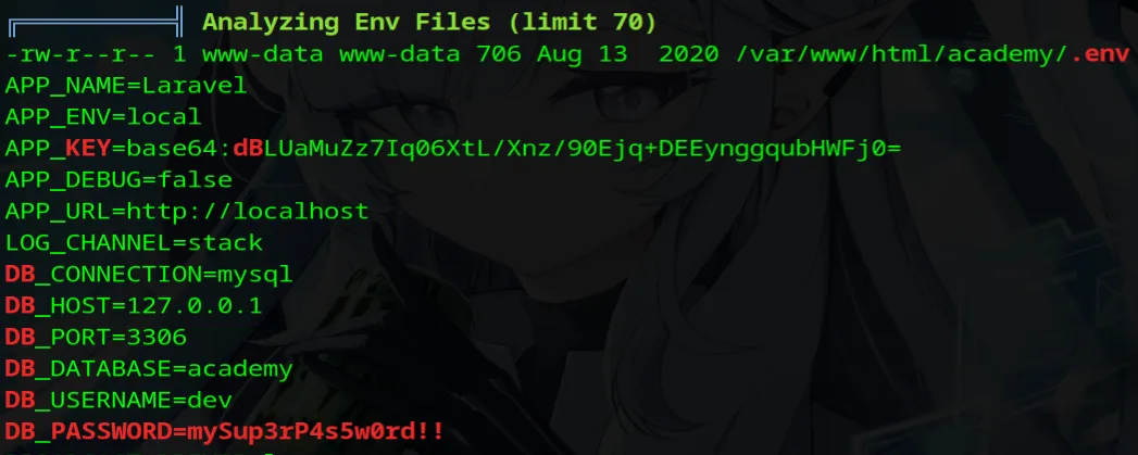 在/var/www/html/academy/.env找到DB_PASSWORD